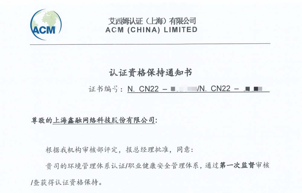 近日,鑫融網絡在環境保護和(hé)員工健康安全方面再次獲得(de)行(xíng)業認可(kě)。環境管理(lǐ)體(tǐ)系認證和(hé)職業健康安全管理(lǐ)體(tǐ)系認證是衡量一個(gè)企業在環境保護和(hé)員工健康安全方面表現的重要标準。艾希姆認證(上(shàng)海)有(yǒu)限公司對鑫融公司的環境管理(lǐ)體(tǐ)系和(hé)職業健康安全管理(lǐ)體(tǐ)系進行(xíng)了現場(chǎng)監督審核,并确認其順利通(tōng)過審查,繼續保持認證資格。鑫融網絡